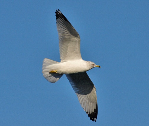 Adult Ring-billed Gull, winter plumage: The bill ring is often visible in flight. Note the distinct black wing tips with comparatively small white spots--note also how deceptive shadows can be