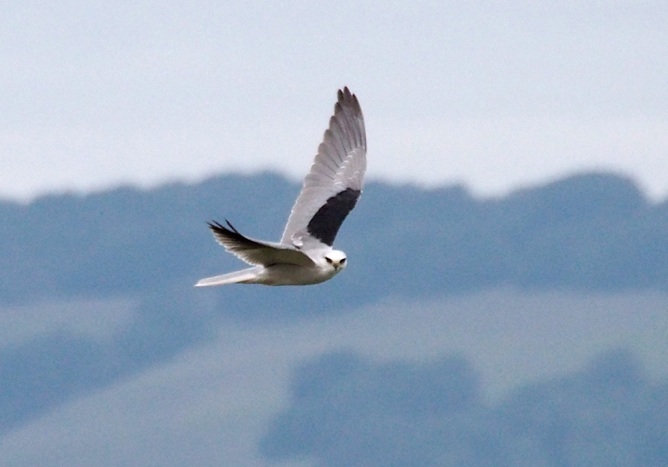 Present in the county year round, but numbers seem to fluctuate. Seriously depleted historically. Bolander and Parmeter quote Grinell who suggests that only about 50 pairs were thought to survive in all of California at one time. Numbers dwindled because of shooting and egg harvesting. Has since made a comeback, and sightings are no longer the rarity they once were. Today it’s not uncommon to see Kites hovering vigorously, looking for prey fairly close to human activity--over the Highway 12 median between Santa Rosa and Sebastopol, for example. Kites mostly feed on small rodents (especially voles) but may also eat large insects such as cicadas and dragonflies. Perches on bushes and trees rather than wires. Holds wings in a U-shaped dihedral when soaring or gliding. May roost communally, except during breeding season. Breeds in the county, using open wooded areas and pasture land mostly in southern low-lying areas. Prefers sites near water.